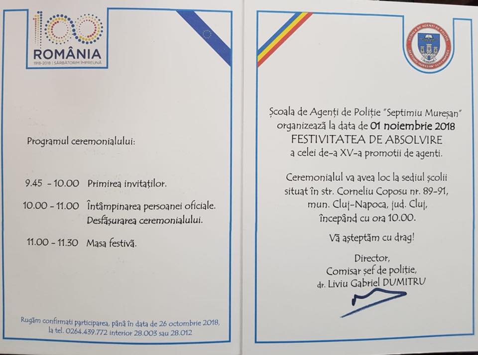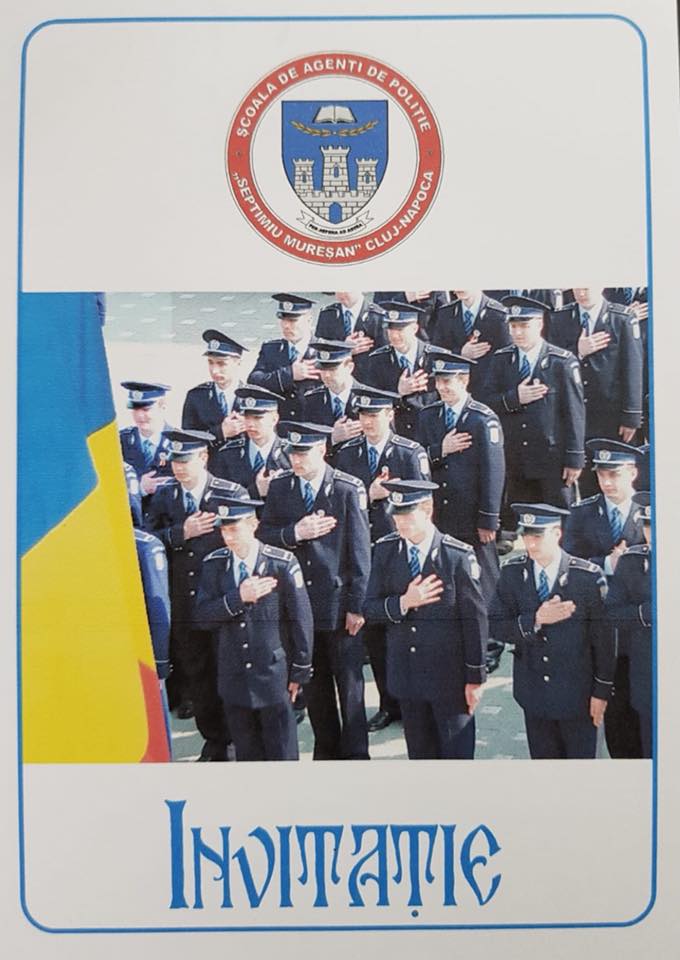 🛑 Mulțumim domnului director comisar-șef de poliție dr. Liviu Gabriel Dumitru pentru invitația adresată de a participa la FESTIVITATEA DE #ABSOLVIRE a celei de-a XV-a promoții de agenți la Școala de Agenți de Poliție “Septimiu Mureșan” – Cluj.