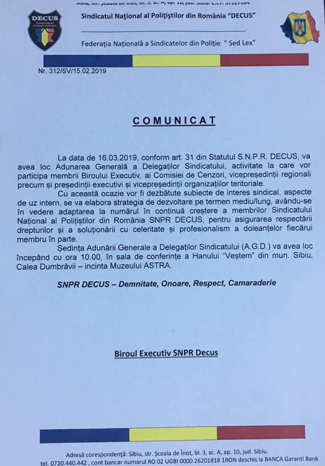 La data de 16.03.2019, conform art. 31 din Statutul SNPR DECUS, va avea loc Adunarea Generală a Delegaților Sindicatului, activitate la care vor participa membrii Biroului Executiv, ai Comisiei de Cenzori, vicepreședinții regionali precum și președinții executivi și vicepreședinții organizațiilor teritoriale.