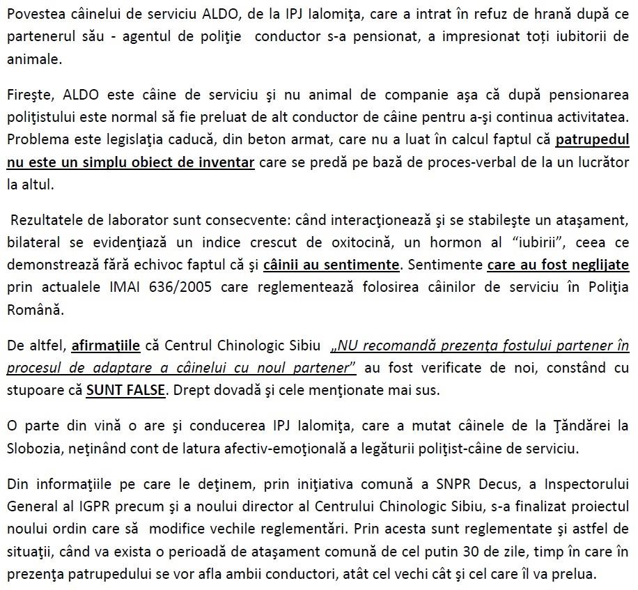 Fireşte, ALDO este câine de serviciu şi nu animal de companie aşa că după pensionarea poliţistului este normal să fie preluat de alt conductor câine pentru a-şi continua activitatea. Problema este legislaţia caducă, din beton armat, care nu a luat în calcul faptul că patrupedul nu este un simplu obiect de inventar care se predă pe bază de proces-verbal de la un lucrător la altul.
