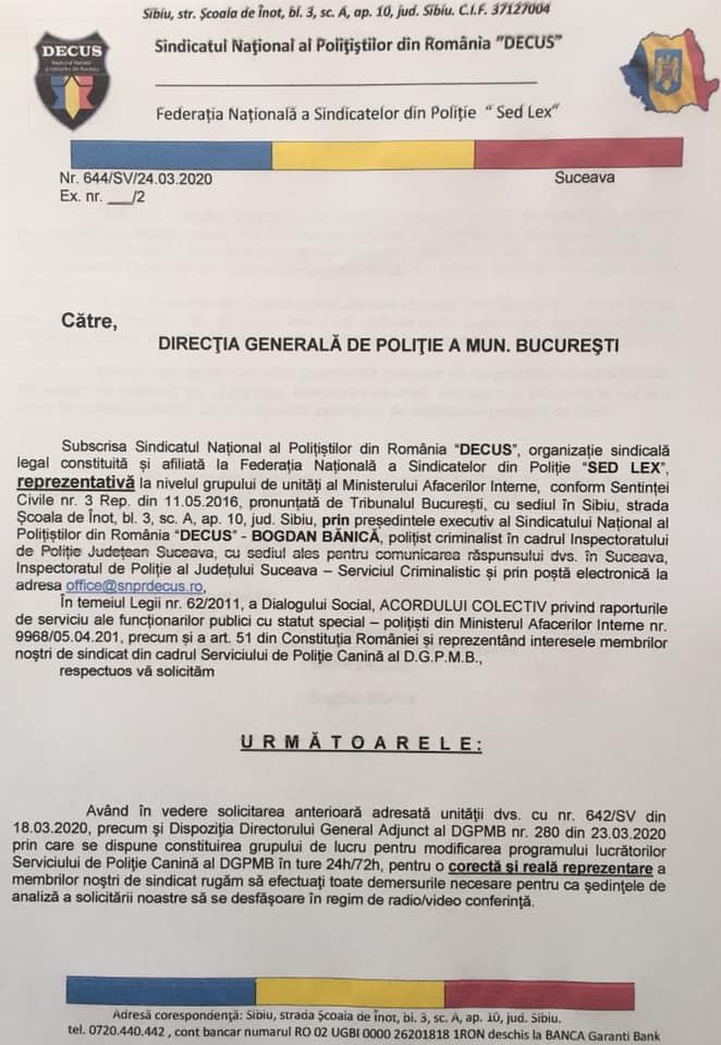 Având în vedere solicitarea anterioară adresată unităţii dvs. cu nr. 642/SV din 18.03.2020, precum şi Dispoziţia Directorului General Adjunct al DGPMB nr. 280 din 23.03.2020 prin care se dispune constituirea grupului de lucru pentru modificarea programului lucrătorilor Serviciului de Poliţie Canină al DGPMB în ture 24h/72h, pentru o corectă şi reală reprezentare a membrilor noştri de sindicat rugăm să efectuaţi toate demersurile necesare pentru ca şedinţele de analiză a solicitării noastre să se desfăşoare în regim de radio/video conferinţă.