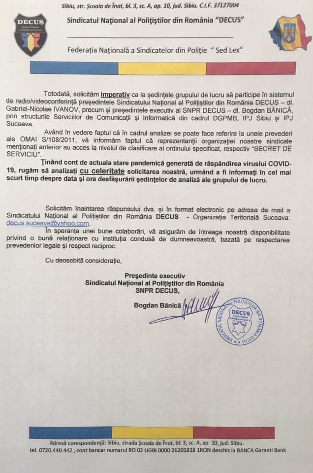 Totodată, solicităm imperativ ca la şedinţele grupului de lucru să participe în sistemul de radio/videoconferinţă preşedintele Sindicatului Naţional al Poliţiştilor din România DECUS – dl. Gabriel-Nicolae IVANOV, precum şi preşedintele executiv al SNPR DECUS – dl. Bogdan BĂNICĂ, prin structurile Serviciilor de Comunicaţii şi Informatică din cadrul DGPMB, IPJ Sibiu şi IPJ Suceava.