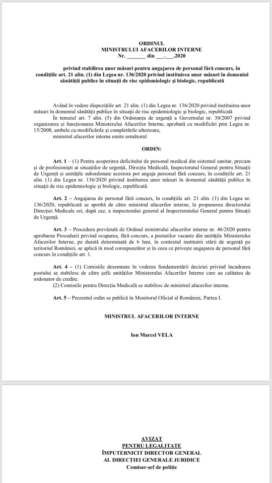 🛑 Luni, 2 noiembrie, va avea loc ședința Comisiei de Dialog Social la nivelul M.A.I., pe ordinea de zi aflându-se și proiectul Ordinului Ministrului Afacerilor Interne privind stabilirea unor măsuri pentru angajarea de personal fără concurs, Având în vedere aspectele prezentate, prin Ordinul m.a.i. nr. 46/2020 a fost aprobată Procedura privind ocuparea, fără concurs, pe durată determinată de 6 luni.