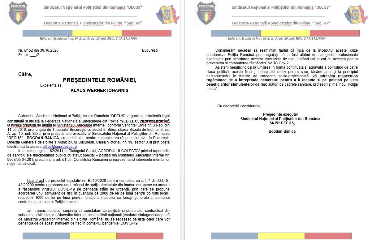 Subscrisul Sindicatul Național al Polițiștilor din România “DECUS”, organizație sindicală legal constituită și afiliată la Federația Națională a Sindicatelor din Poliție “SED LEX”, reprezentativă la nivelul grupului de unități al Ministerului Afacerilor Interne, conform Sentinței Civile nr. 3 Rep. din 11.05.2016, pronunțată de Tribunalul București, cu sediul în Sibiu, strada Școala de Înot, bl. 3, sc. A, ap. 10, jud. Sibiu, prin președintele executiv al Sindicatului Național al Polițiștilor din România “DECUS” – BOGDAN BĂNICĂ, cu sediul ales pentru comunicarea răspunsului dvs. în București, Direcția Generală de Poliție a Municipiului București, Calea Victoriei, nr. 19, sector 3 și prin poștă electronică la adresa [email protected],