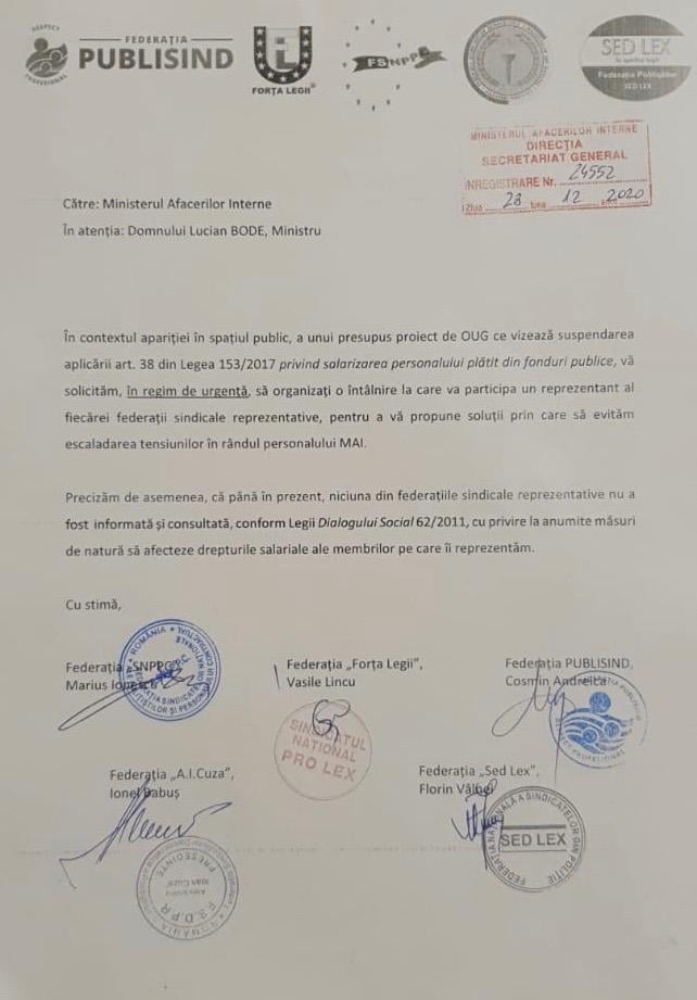 🛑 În contextul apariției în spațiul public a unui presupus proiect de OUG ce vizează suspendarea aplicării art. 38 din Legea 153/2017 privind salarizarea personalului plătit din fonduri publice, am solicitat la unison, prin Federația Națională a Polițiștilor SED LEX la care suntem afiliați, organizarea în regim de urgență a unei întâlniri de dialog social cu noul Ministru al Afacerilor Interne – Lucian BODE.