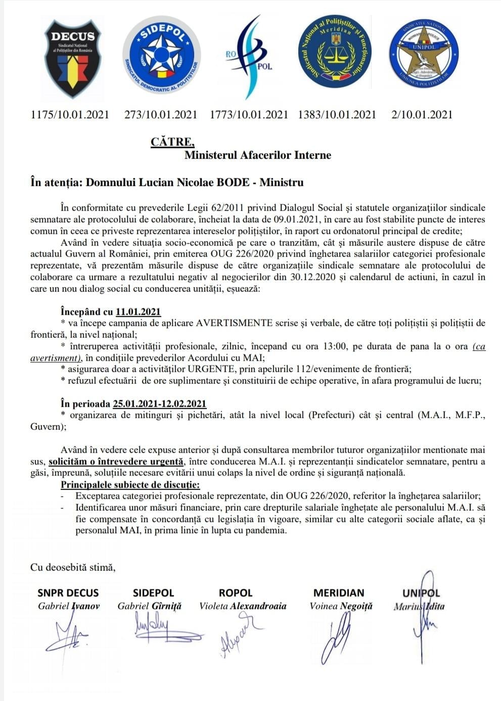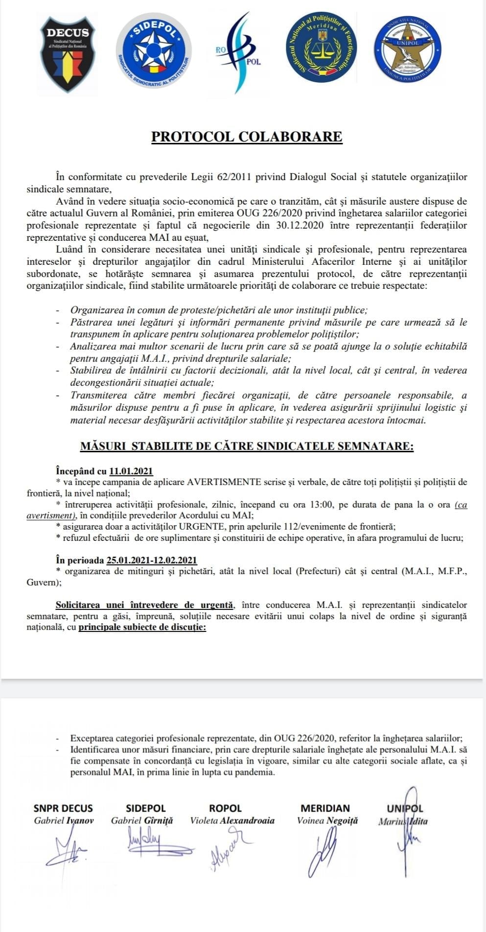 Având în vedere situaţia socio-economică pe care o tranzităm, cât şi măsurile austere dispuse de către actualul Guvern al României, prin emiterea OUG 226/2020 privind înghetarea salariilor categoriei profesionale reprezentate și faptul că negocierile din 30.12.2020 între reprezentanții federațiilor reprezentative și conducerea MAI au eșuat, organizațiile sindicale SNPR #DECUS, SIDEPOL, ROPOL, MERIDIAN și UNIPOL și-au asumat printr-un Protocol de colaborare: