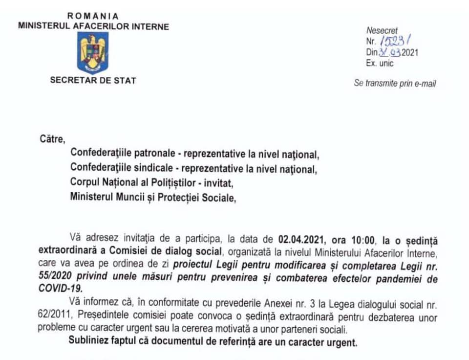 În data de 02.04.2021, la sediul Ministerului Afacerilor Interne, a fost convocată o ședință extraordinară a Comisiei de Dialog Social, având ca ordine de zi cu caracter de urgență modificarea și completarea Legii nr. 55/2020.