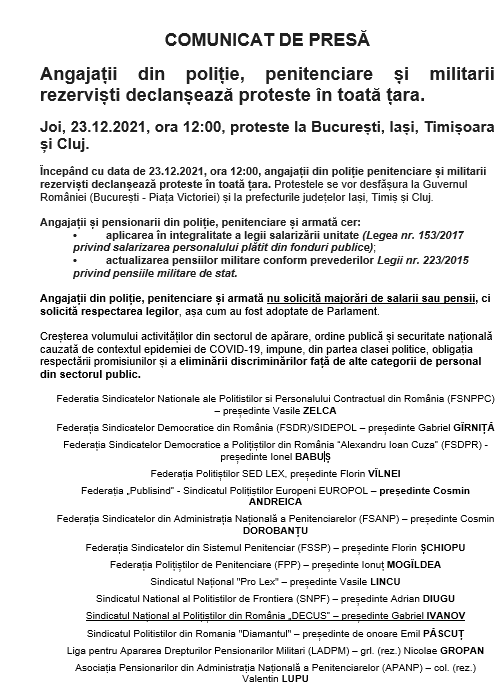 Începând cu data de 23.12.2021, ora 12:00, angajații din poliție, penitenciare și militarii rezerviști declanșează proteste în toată țara. Protestele se vor desfășura la Guvernul României (București – Piața Victoriei) și la prefecturile județelor Iași, Timiș și Cluj.