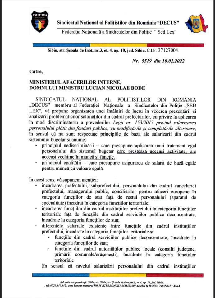 🛑 Reprezentând interesele membrilor noștri de sindicat – angajați ai prefecturilor și având în vedere aplicarea în mod discriminatoriu a prevederilor Legii 153/2017, am solicitat Ministrului Afacerilor Interne – Lucian Bode o întâlnire de lucru în vederea dezbaterii problematicii menționate.