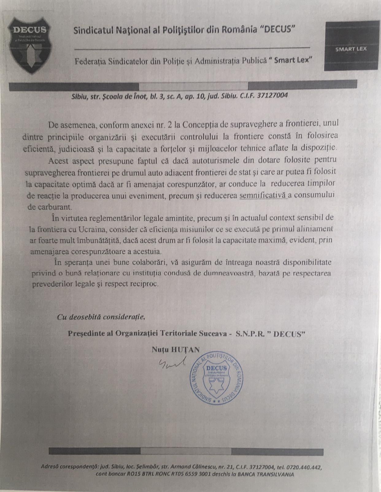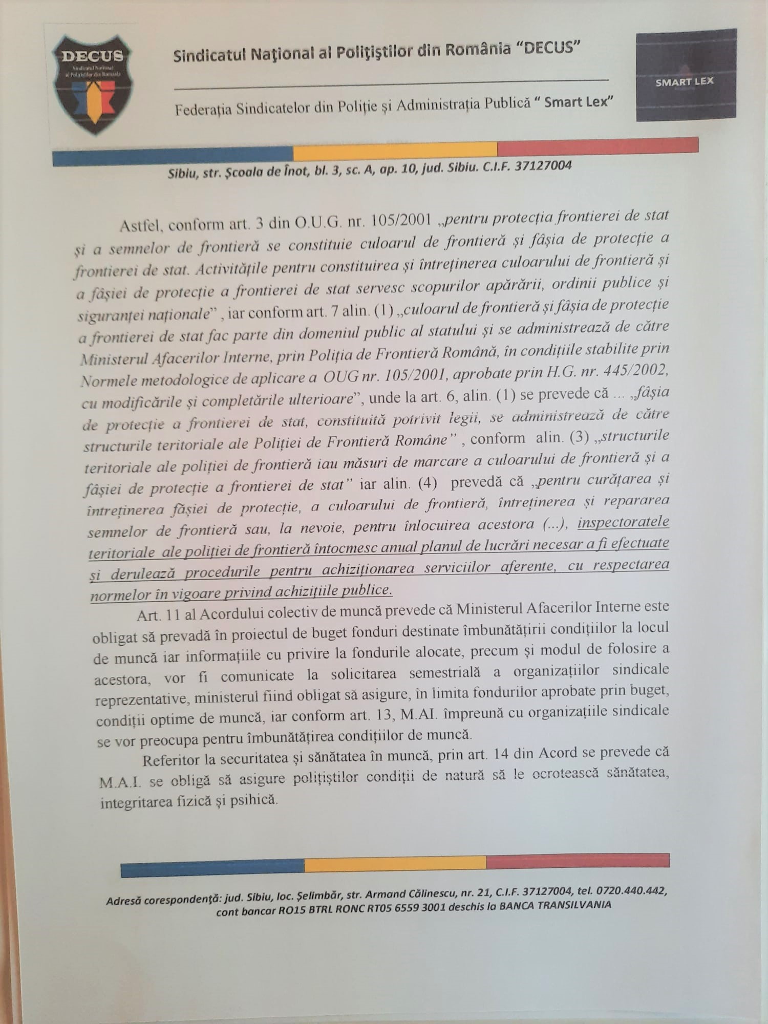 (…) “vă solicităm să întrepindeți demersuri în vederea amenajării drumului auto adiacent frontierei de stat a României și a podețelor aferente, în scopul efectuării misiunilor specifice de supraveghere a frontierei de stat în condiții optime, acest drum fiind parte componentă a fâșiei de protecție a frontierei de stat.”
