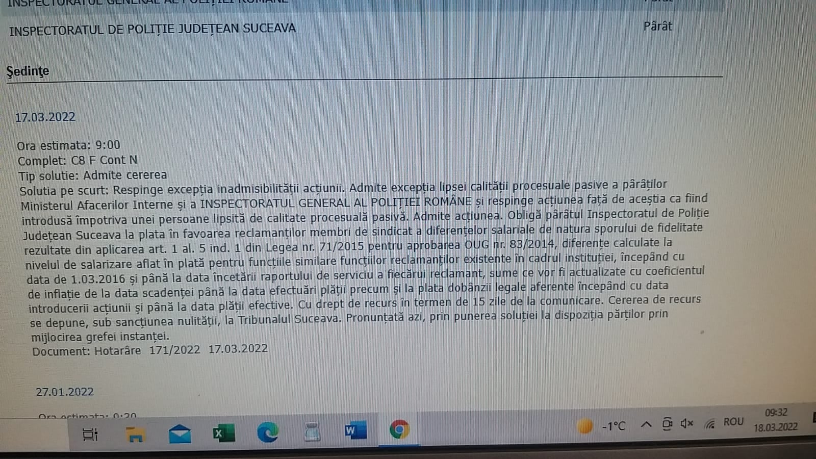 Conform ultimelor informații de pe site-ul: www portal just.ro mai precis din data de 17.03.2022 referitor la soluționarea cauzei din Dosarul Nr. 576/86/2019 aflat pe rolul instanței Contencios Administrativ si Fiscal din cadrul Tribunalului Suceava, constatăm faptul că polițiștii din cadrul Inspectoratului de Poliție Județean Suceava, membrii ai Sindicatului Național al Polițiștilor din România „DECUS” vor primi sumele aferente sporului de fidelitate/nivelului de salarizare în plată recalculate începând cu data de 01.03.2016 până la data încetării raportului de serviciu a fiecărui membru, prin aplicarea prevederilor legale prevăzute de art.1 alin.(5) ind.1 din Legea Nr.71/2015 pentru aprobarea O.U.G. Nr.83/2014.