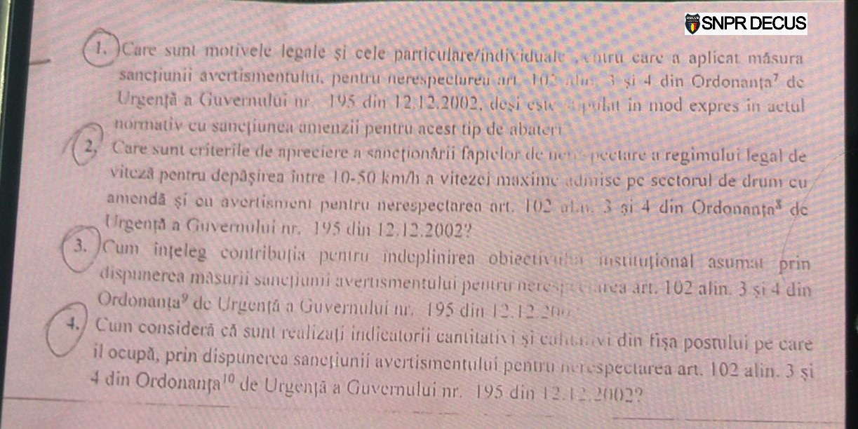 După cum se poate observa din întrebările adresate, acestea au ca scop precis determinarea prin intimidare a polițiștilor rutieri să aplice amenzi în loc de avertisment, într-un mod ilegal și abuziv, având în vedere faptul că AGENTUL CONSTATATOR este SINGURUL în măsură să aprecieze tipul sancțiunii aplicate.