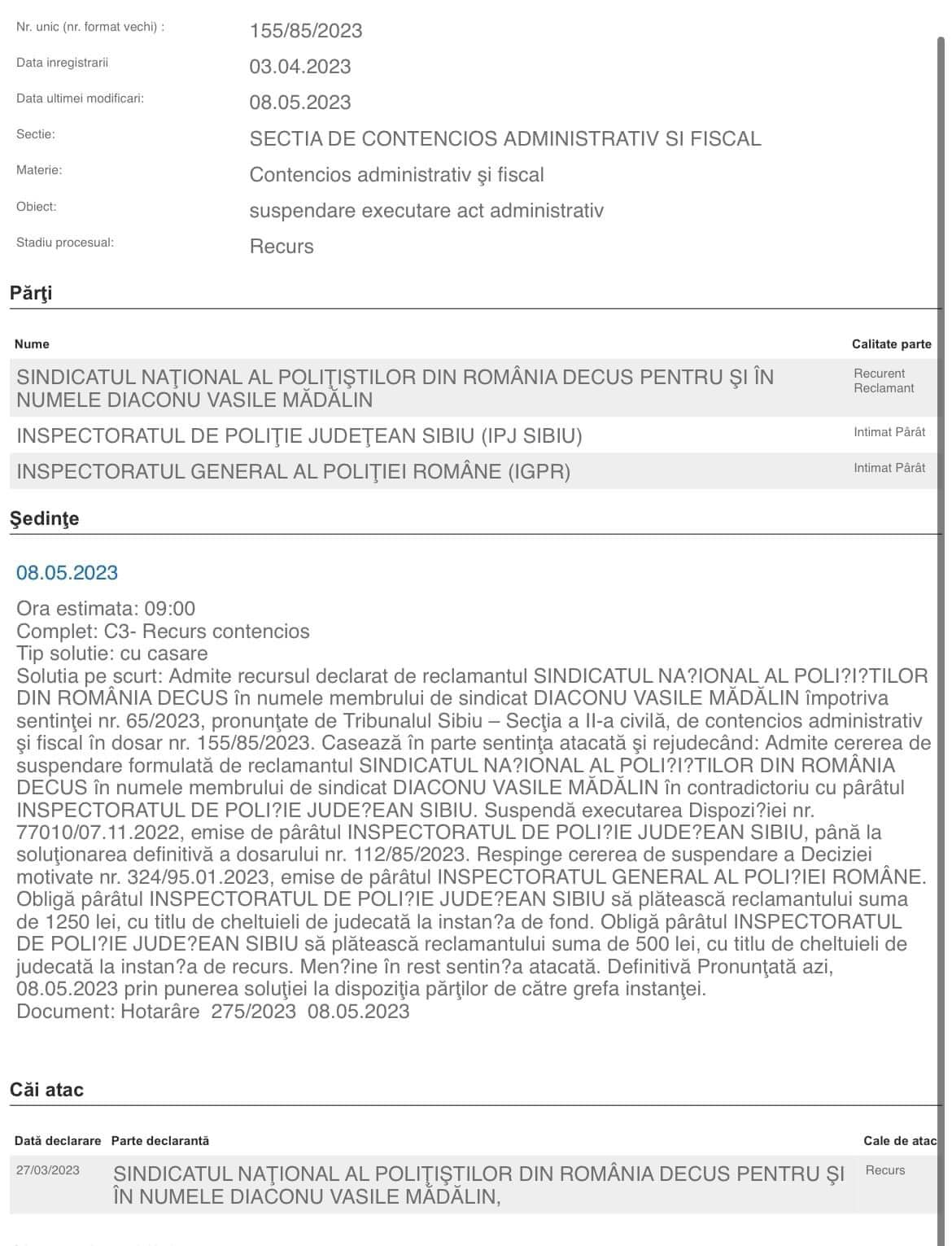 Curtea de Apel Alba Iulia a dispus ca și cel de-al doilea polițist din cadrul IPJ Sibiu, care a fost sancționat cu #destituirea din Poliție (reprezentat de Sindicatul DECUS) să fie repus pe funcție! 👏
