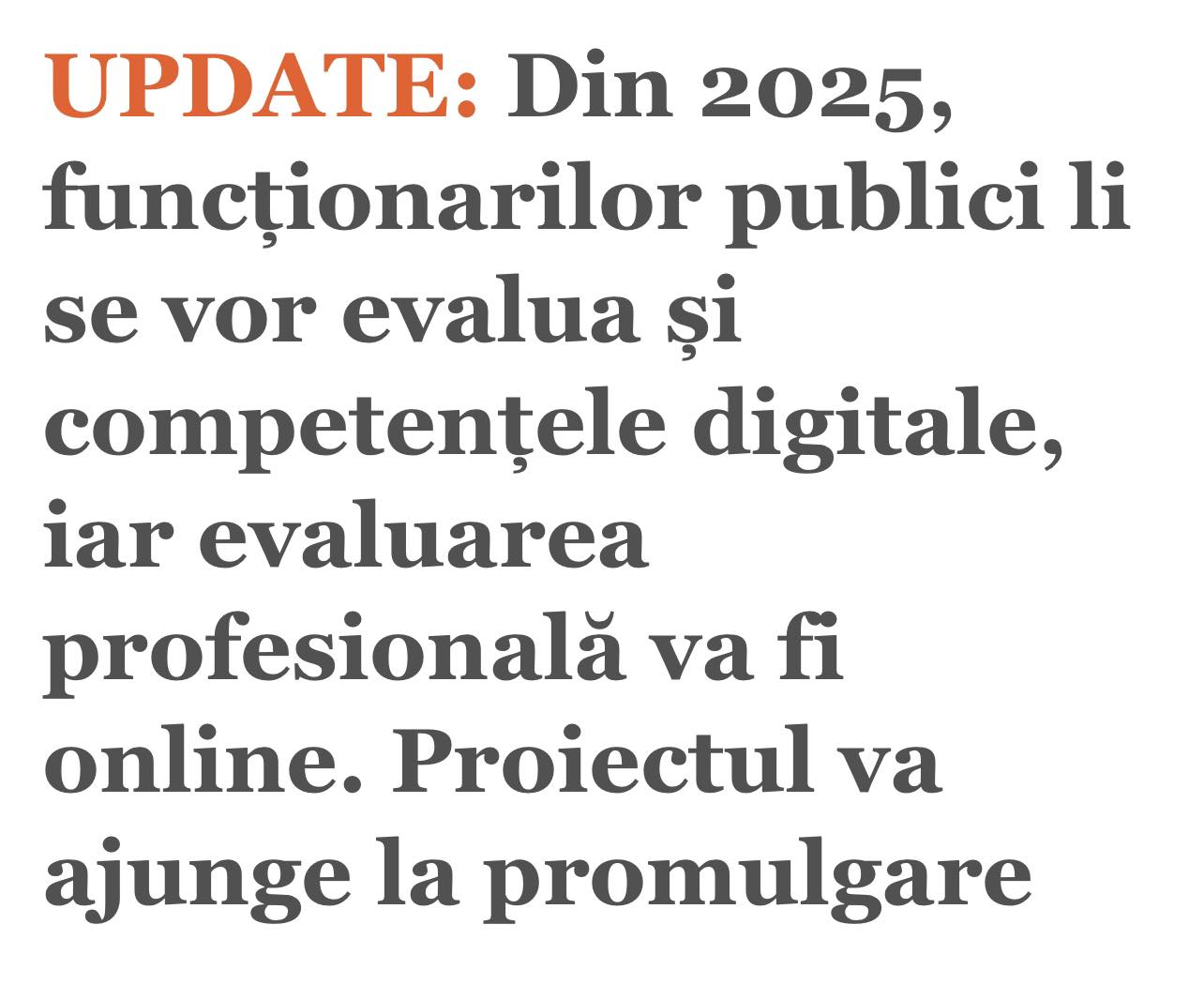 Din 2024, funcționarii publici vor fi evaluați și pentru competențele digitale, conform unui proiect de lege care mai trebuie doar promulgat și publicat în Monitorul Oficial. Integral, evaluarea profesională se va face prin intermediul unui sistem informatic al Agenției Naționale a Funcționarilor Publici, chestiune neprevăzută acum în legislație.