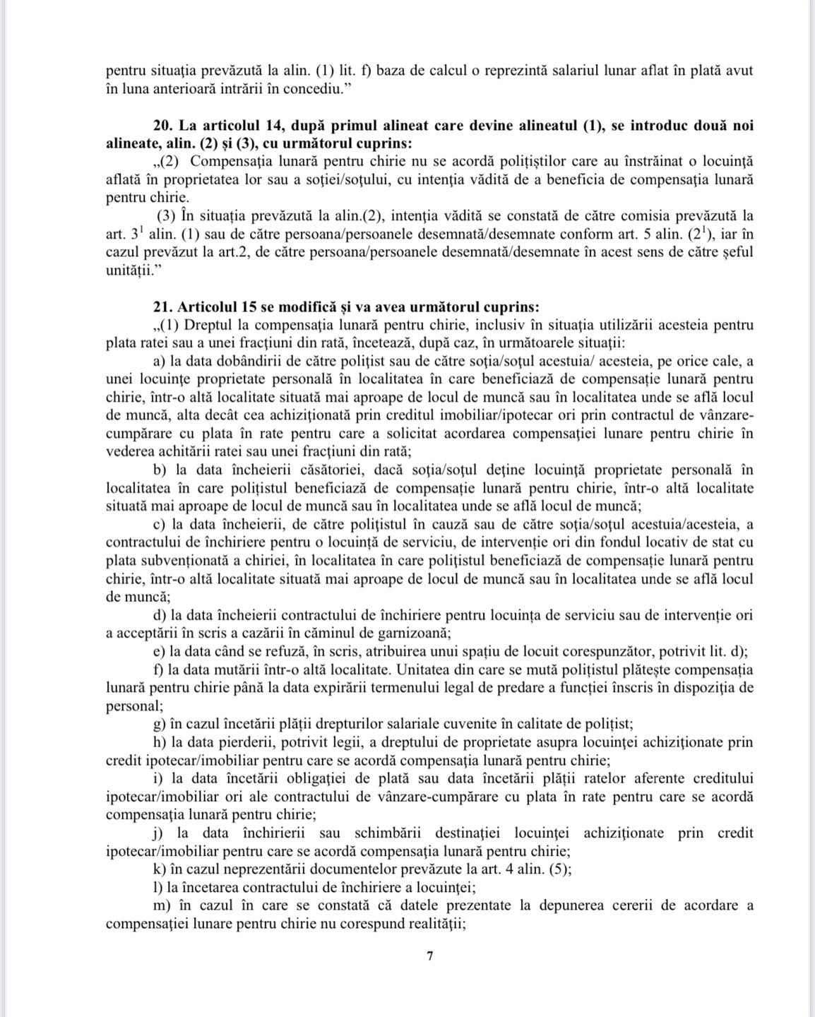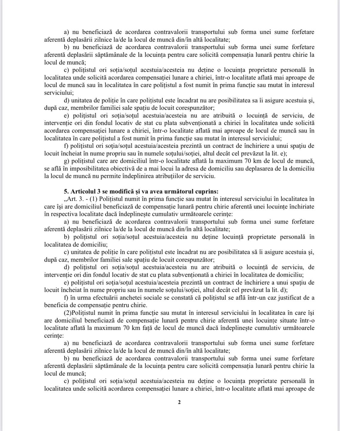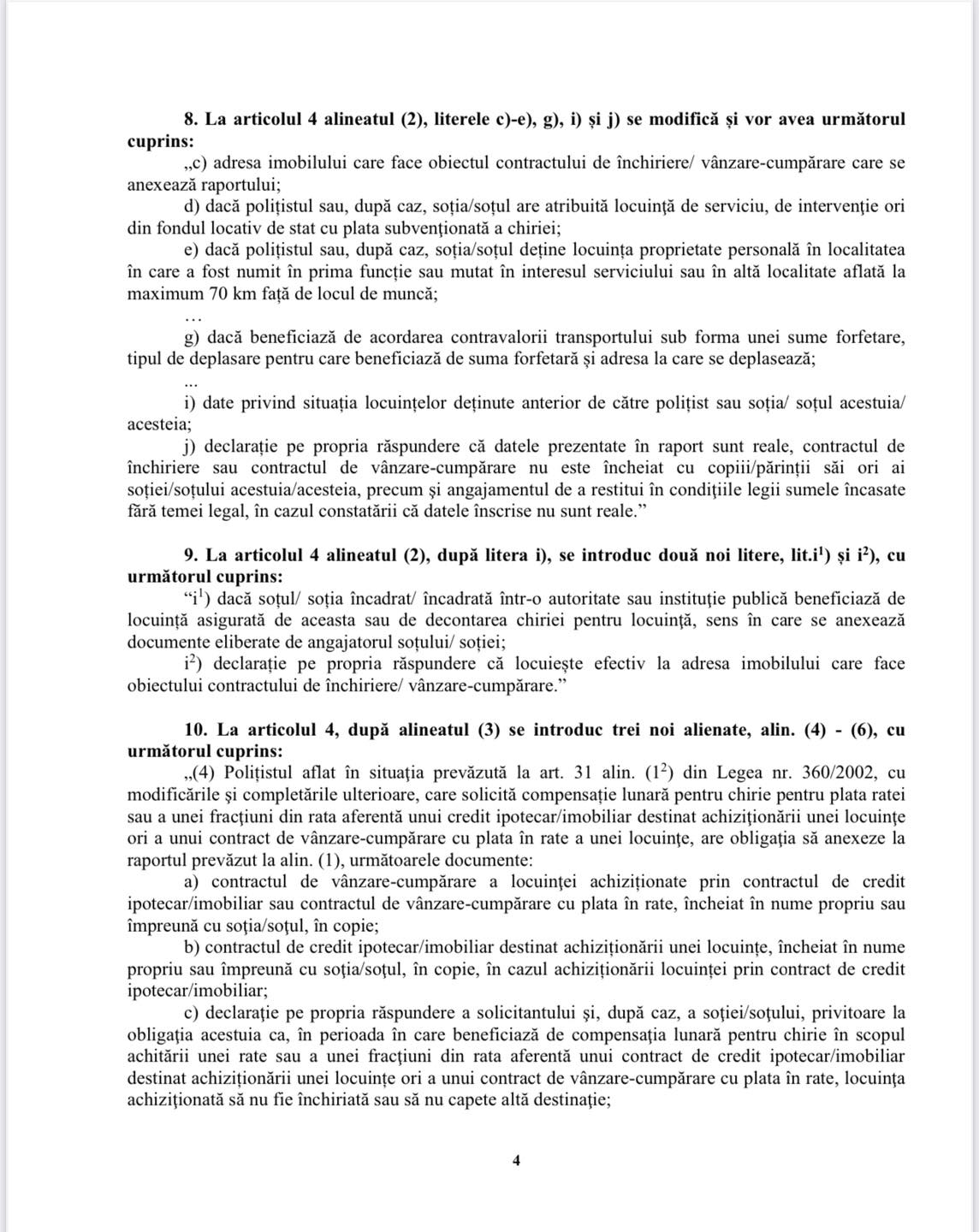 Printre aspectele semnalate de către CNSLR Frăția se regăsește introducerea tezei a doua a literei g) punctul 4, care vizează condiționarea acordării compensației pentru chirie. Conform acestei modificări, polițiștii nu ar urma să beneficieze de compensație dacă “deplasarea de la domiciliu la locul de muncă nu permite îndeplinirea atribuțiilor de serviciu”. Sindicatul a subliniat că această formulare este susceptibilă de interpretări subiective și poate conduce la potențiale abuzuri.