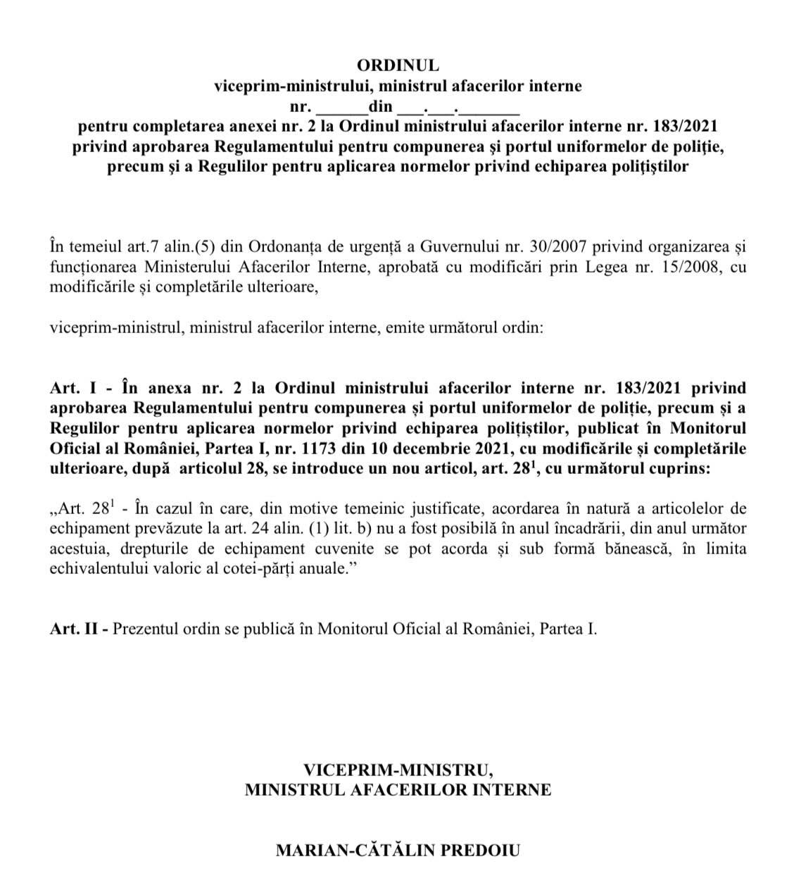 În acest context, OMAI 183/2021 se va modifica, adăugându-se un nou articol (vezi foto), pentru reglementarea acordării drepturilor de echipament cuvenite sub formă bănească, din anul următor încadrării, în limita echivalentului valoric al cotei-părți anuale.