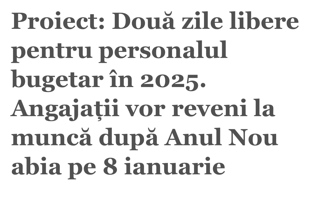 📢 Noutăți pentru angajații bugetari: Conform unui proiect de hotărâre publicat vineri de Ministerul Muncii, zilele de 3 ianuarie și 2 mai 2025 vor fi libere pentru angajații din sistemul bugetar, dar vor trebui recuperate ulterior. 📅