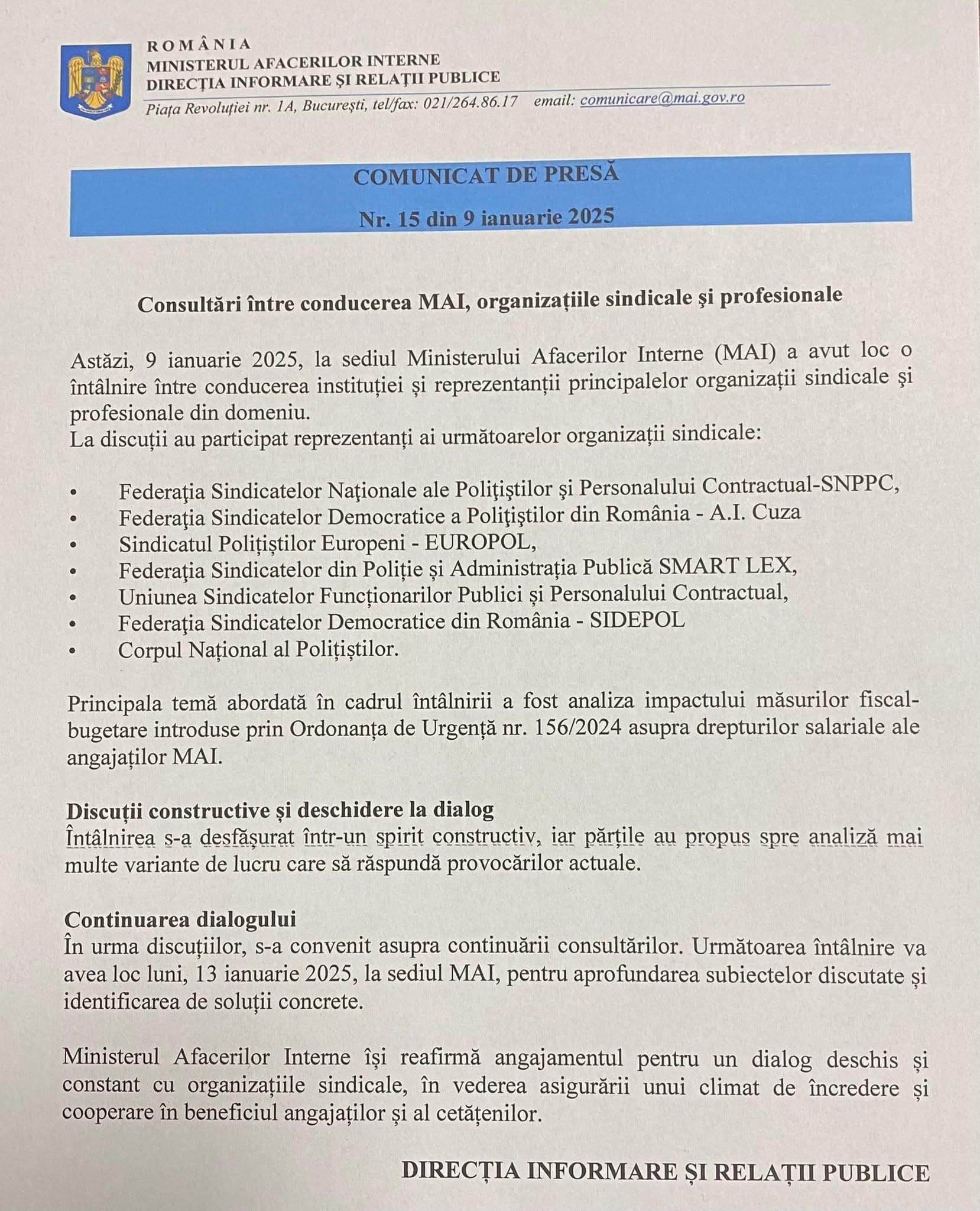 Ministerul Afacerilor Interne rămâne dedicat unui dialog deschis cu organizațiile sindicale, în beneficiul angajaților și al cetățenilor.